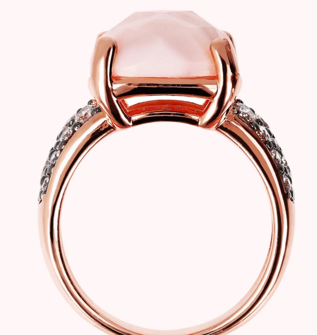Anello cocktail Bronzallure, realizzato in lega Golden Rosé, placcato oro rosa 18kt, impreziosito da una pietra naturale centrale sfaccettata (12 mm) e da pavé in cubic zirconia, qualità luminosa.