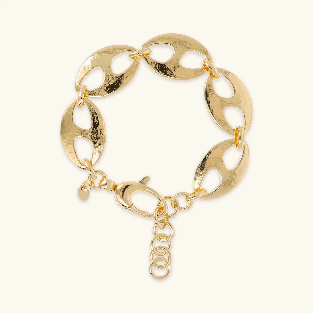 Bracciale Etrusca Gioielli realizzato in lega Golden, placcata oro giallo 18kt, impreziosito da maglie marine con superficie martellata; chiusura a moschettone con extender.Placcatura oro giallo 18kt Lega brevettata Golden Designed and made in Italy Ipoallergenico