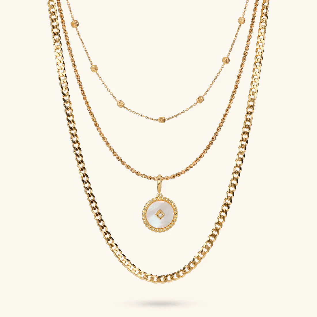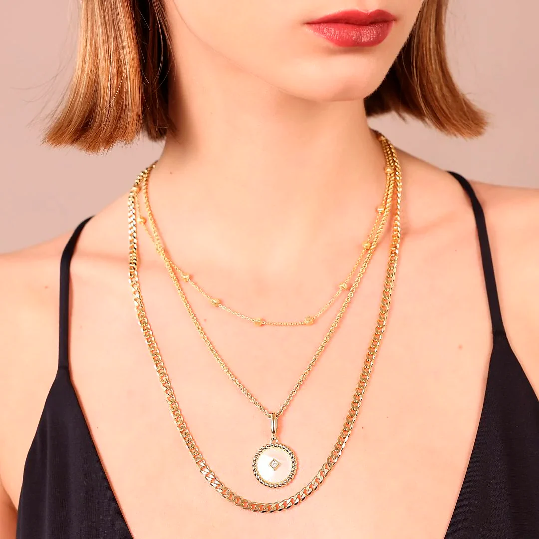 Collana multi-filo Etrusca Gioielli realizzata in lega Golden, placcata Oro giallo 18kt, composta da una catena rosario (40.6 cm) con elementi a cubetti diamantati; una catena corda (45.7 cm) con pendente tondo in madreperla bianca, bordi in rilievo e punto luce in cubic zirconia; una catena grumetta classica (55.8 cm); chiusura a moschettone.Placcatura oro giallo 18ktLega brevettata GoldenDesigned and made in ItalyIpoallergenica