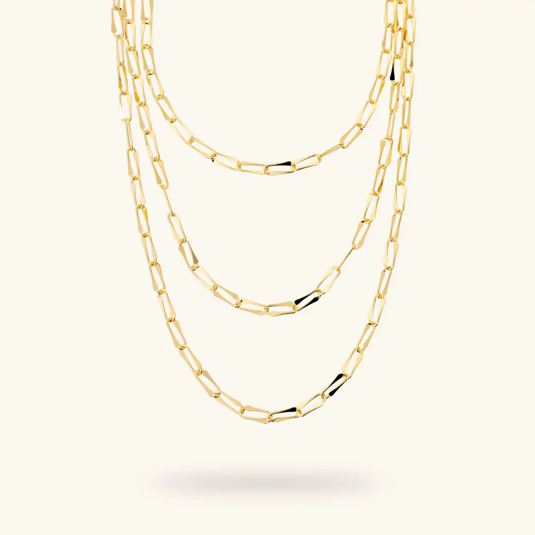 Collana multi-filo Etrusca Gioielli realizzata in lega Golden, placcata Oro giallo 18kt, dal design graduato con maglie rettangolari squadrate. Finitura lucida. Chiusura a moschettone. Lunghezza filo più corto 40.5cm, filo intermedio 50cm, filo più lungo 61cm.Lega brevettata GoldenPlaccatura in Oro Giallo 18KtMade in ItalyIpoallergenica & Nickel Free