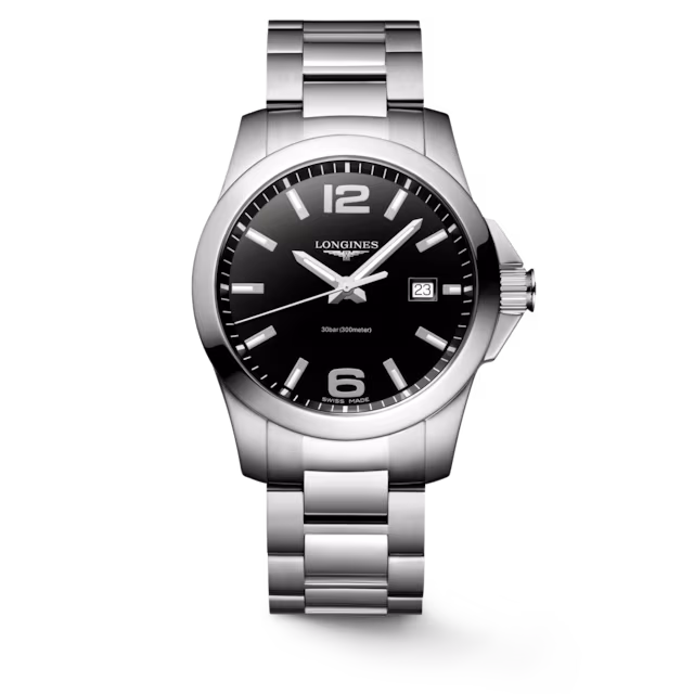 CONQUEST, L3.759.4.58.6, orologio al quarzo, Ø 41.00 mm, acciaio inossidabile.Date.Corona a vite, impermeabile fino a 30 bar, vetro zaffiro antigraffio con trattamento antiriflesso sul lato interno.Quadrante nero laccato lucido, swiss super-luminova®.Bracciale in acciaio inossidabile, con chiusura déployante a tripla sicurezza e meccanismo di apertura a pressione.