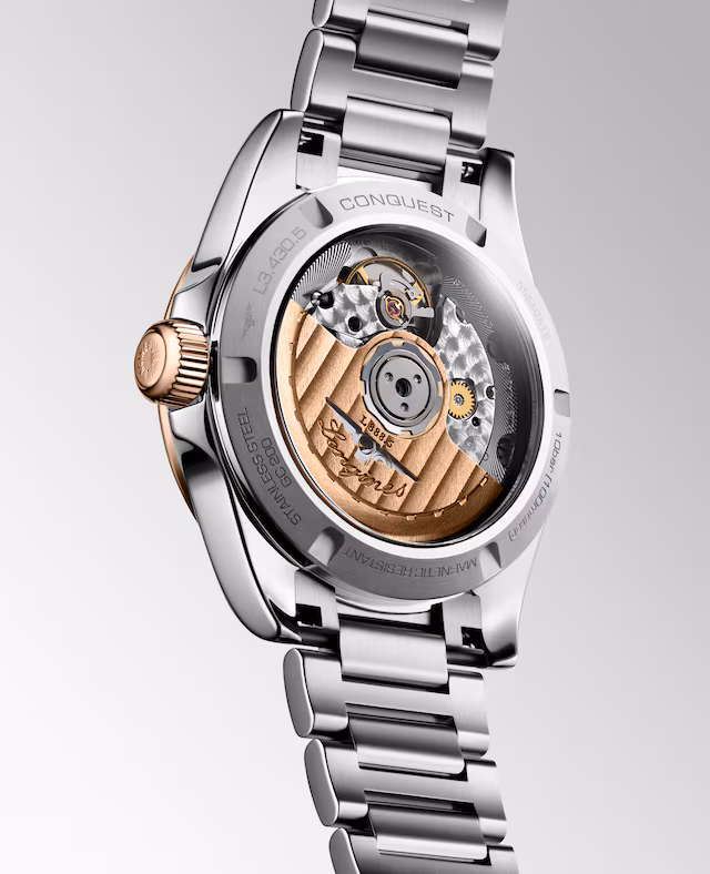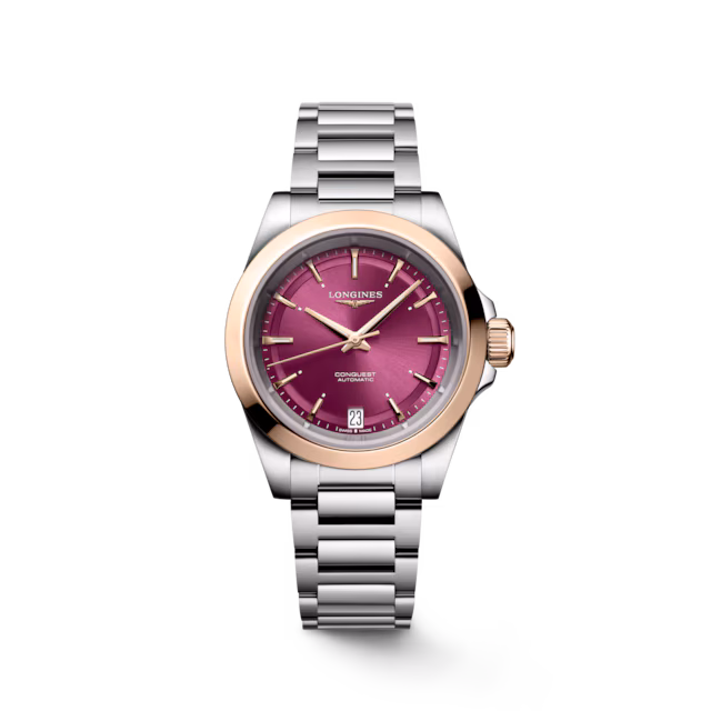 CONQUEST, L3.430.5.98.6, orologio automatico, Ø 34.00 mm, acciaio inossidabile e lunetta girevole bidirezionale con inserto spazzolato circolare sovrastato da una coiffe in oro rosa 18 carati 5n.Date, movimento meccanico a carica automatica con frequenza di 25'200 alternanze orarie e riserva di carica di circa 72 ore, bilanciere-spirale in silicio monocristallino.Corona a vite, impermeabile fino a 10 bar, vetro zaffiro antigraffio con trattamento antiriflesso multistrato su entrambi i lati.Quadrante sunray purple, swiss super-luminova®.Bracciale in acciaio inossidabile, con chiusura déployante a tripla sicurezza e meccanismo di apertura a pressione.
