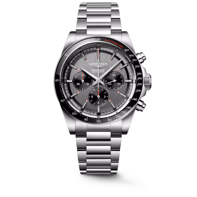 CONQUEST CHRONO SKI EDITION, L3.836.4.52.9, orologio automatico, Ø 42.00 mm, acciaio inossidabile e lunetta in ceramica.Cronografo date, movimento meccanico a carica automatica con frequenza di 28'800 alternanze orarie e riserva di carica di circa 59 ore.Corona a vite, impermeabile fino a 10 bar, vetro zaffiro antigraffio con trattamento antiriflesso multistrato su entrambi i lati.Quadrante antracite, swiss super-luminova®.Bracciale in acciaio inossidabile, con chiusura déployante a tripla sicurezza e meccanismo di apertura a pressione.