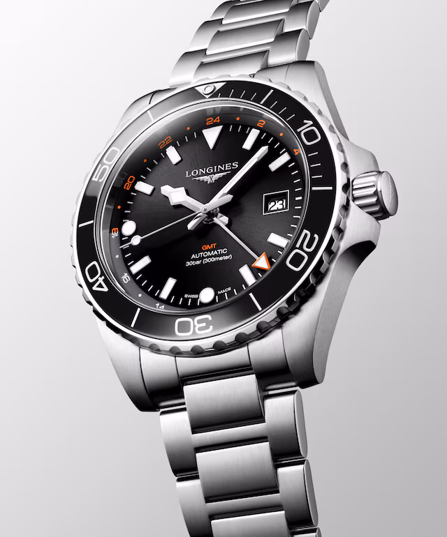 HYDROCONQUEST GMT, L3.890.4.56.6, orologio automatico, Ø 43.00 mm, acciaio inossidabile e lunetta in ceramica.Gmt date, movimento meccanico a carica automatica con frequenza di 25'200 alternanze orarie e riserva di carica di circa 72 ore.Corona a vite lunetta girevole unidirezionale, impermeabile fino a 30 bar, vetro zaffiro antigraffio con trattamento antiriflesso multistrato su entrambi i lati.Quadrante nero a raggi di sole, swiss super-luminova®.Bracciale in acciaio inossidabile, con doppia chiusura deployante di sicurezza con sistema di microregolazione.