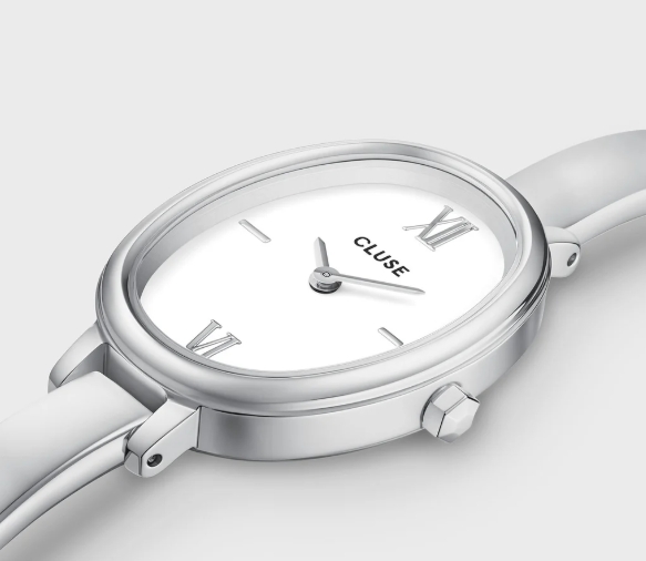 L'orologio ovale L'Ovale da donna è caratterizzato da una cassa color argento da 30 mm, un quadrante bianco e un cinturino a bracciale in acciaio inossidabile color argento da 6 mm.