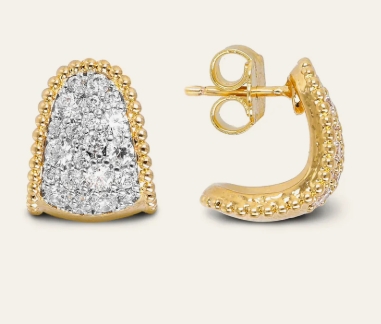 Orecchini a lobo realizzati in lega Golden, placcata oro giallo 18kt, dal design graduato con superficie pavé in cubic zirconia, qualità luminosa, e piccoli puntini in Golden. Chiusura a perno e farfalla.Placcatura oro giallo 18kt Lega brevettata Golden Designed and made in Italy IpoallergeniciMateriale: Golden Peso (g): 6.6