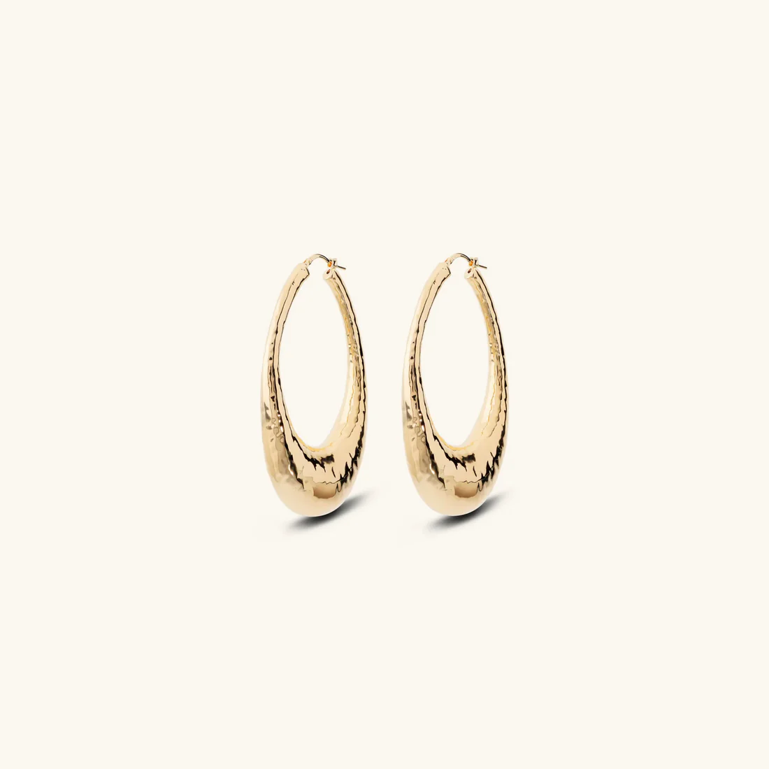 Orecchini a cerchio Etrusca Gioielli realizzati in lega Golden, placcata Oro giallo 18kt, dal design ovale e graduato con superficie finemente martellata. Finitura lucida. Chiusura a baionetta.Lega brevettata Golden Placcatura in Oro Giallo 18Kt o Rodio Made in Italy Ipoallergenici & Nickel Free