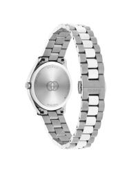 Per le ultime collezioni, la linea G-Timeless è rivisitata in una palette cromatica dalle tonalità vivaci che mettono in risalto i motivi emblematici della Maison. Caratterizzato da cinturino in acciaio inox, questo orologio presenta una lunetta tonalità oro giallo con diamanti.