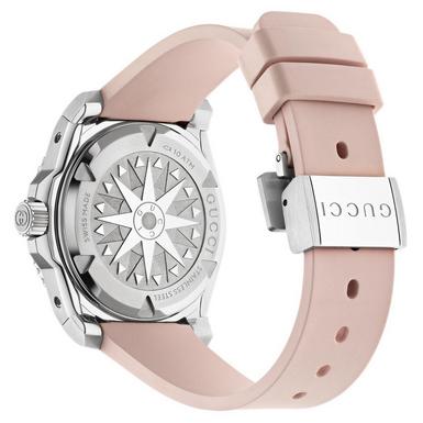 Ispirata al classico design degli orologi subacquei, la collezione Gucci Dive coniuga alla perfezione stile senza tempo, prestazioni elevate e allure sportiva. Alimentato da un movimento automatico, questo orologio presenta un cinturino in gomma rosa e un quadrante rosa con lunetta in ceramica nera.