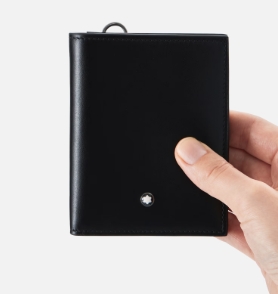 Il portafoglio compatto Meisterstück con sei aperture per carte di credito è realizzato in una nuova tipologia di pelle nera estremamente lucida. Il nuovo design interno geometrico e lineare ne sottolinea l’essenza funzionale, con più aperture per carte di credito e tasche per contanti e ricevute. Questo portafogli può essere portato comodamente con un laccetto da collo (venduto separatamente) o riposto in tasca.