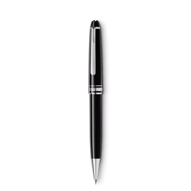 Gli strumenti da scrittura Meisterstück Classique in pregiata resina nera con eleganti dettagli finitura platino. coronati dall'emblema Montblanc bianco. rappresentano un'esclusiva icona di design.